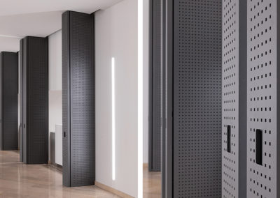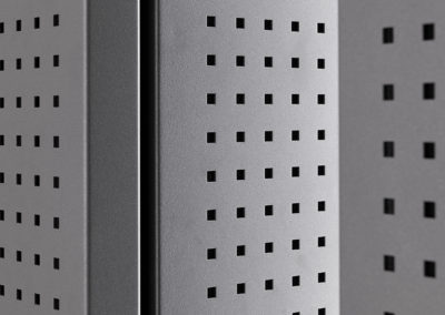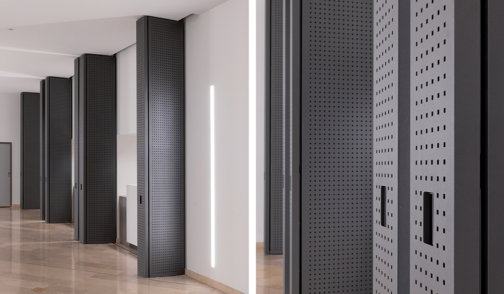 The removable acoustic partitions made of lacquered steel have been personalised by their mechanism as well as by the design in the open position.