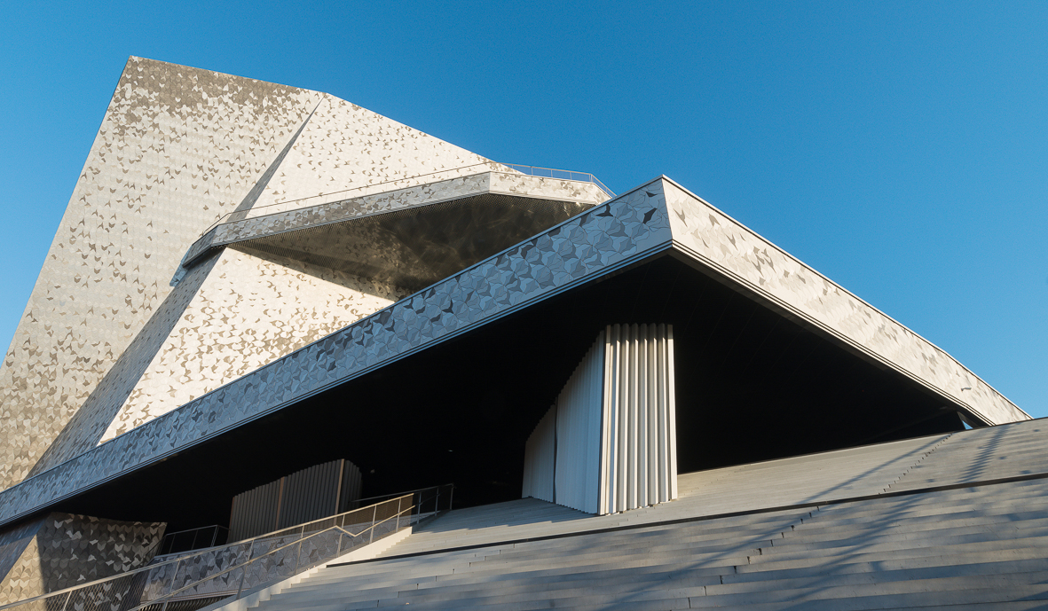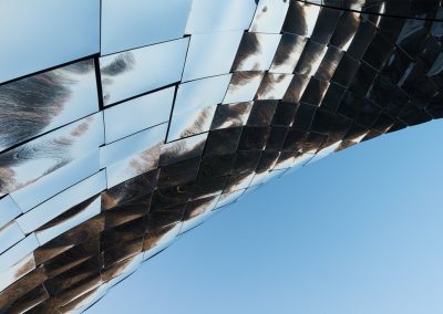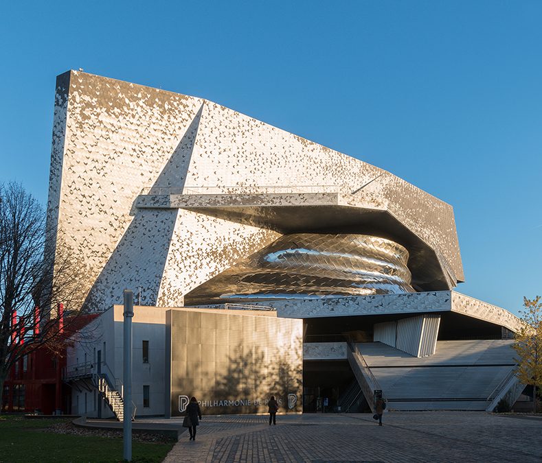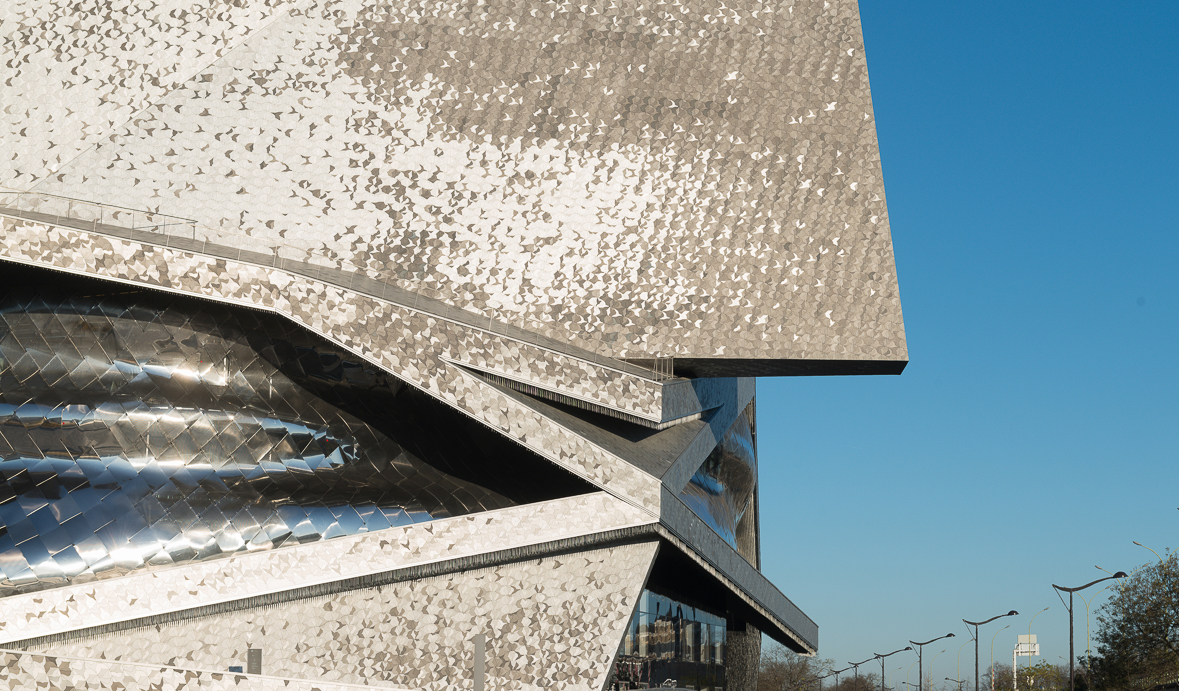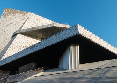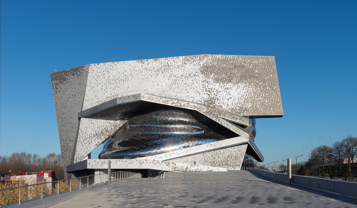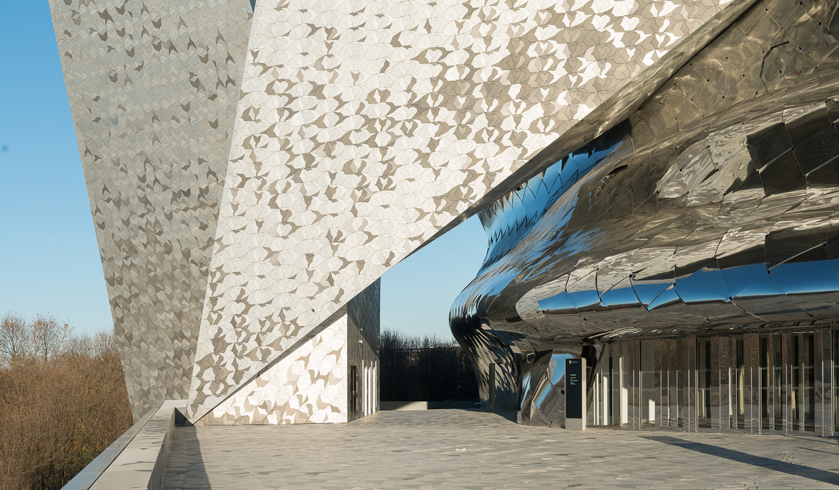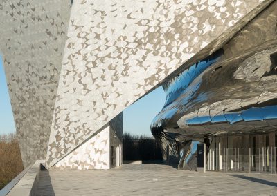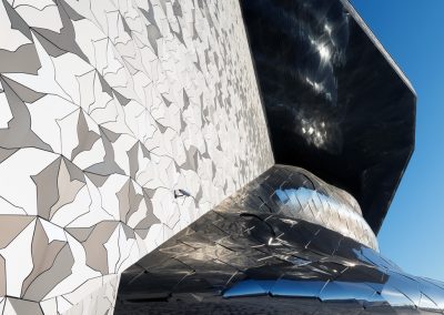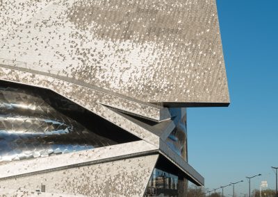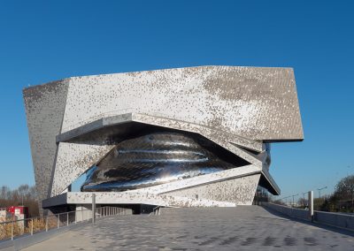 The core of the Philharmonic, called the ‘tourbillon’, was covered with 3,500 m² plates of stainless steel 316. The surface was chemically polished. Each plate of +/- 1.2 x 1.2 mm was bent according to its positioning. Some sheets were perforated to allow the light to go through.